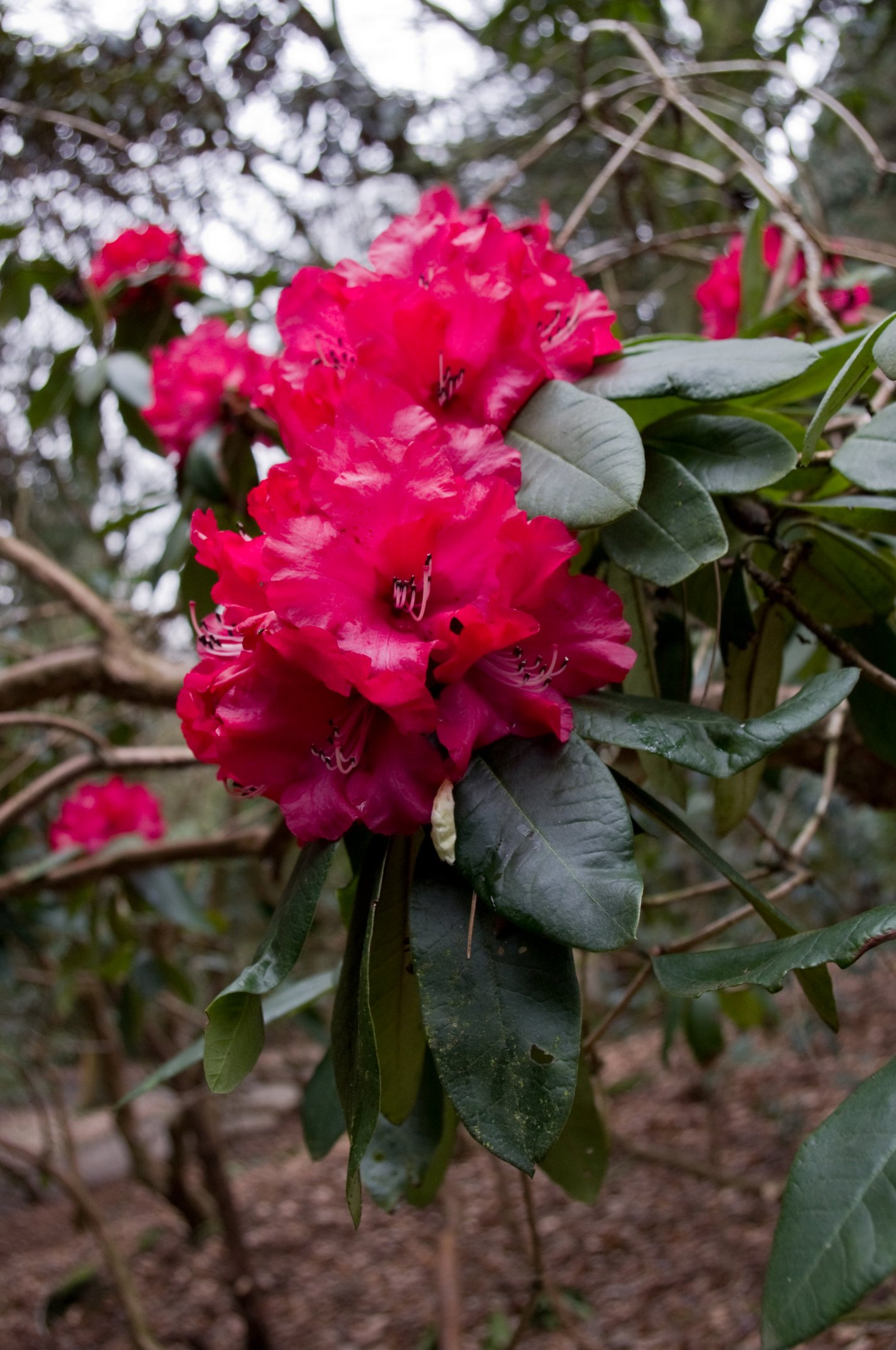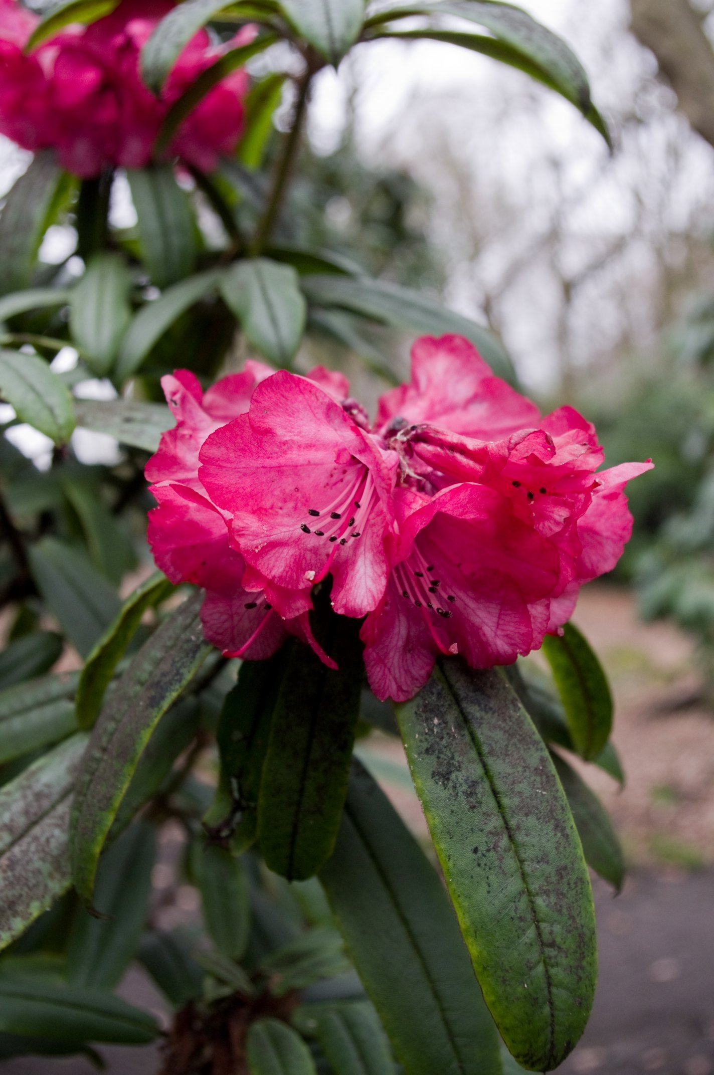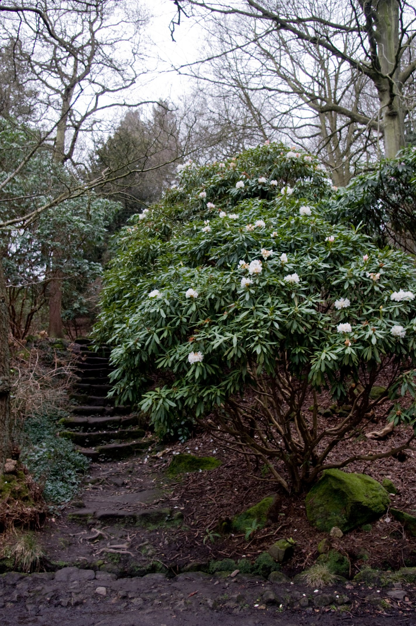 The Camellia and the Scilla are in the ‘Croquet lawn’ garden opposite the entrance from Weetwood Lane. The Mahonia aquifolium is in the winter garden next to the car park. The Prunus ‘Kursar’ is in the ‘Woodland Shrub Garden’ east of the tennis courts and west of Meanwood Beck. The skunk cabbage is scattered along a small muddy stream running down to the mill leat. The Rhododendrons are in various places scattered along the hillside – the major display of Rhododendrons will be in another few weeks.